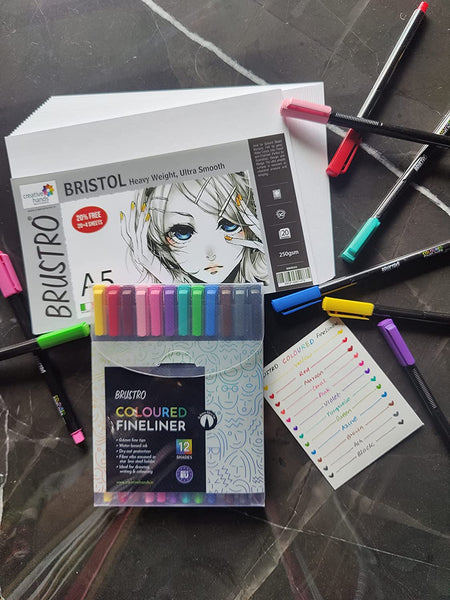 BRUSTRO Coloured Fineliner Set of 12 | Assorted Colours | 0.4mm | Ideal for Writing, Drawing, Coloring, Sketching, Doodles, Mandala Art & BRISTOL Ultra-Smooth Paper | A5, 250 gsm, 20+4 sheets/48 pages