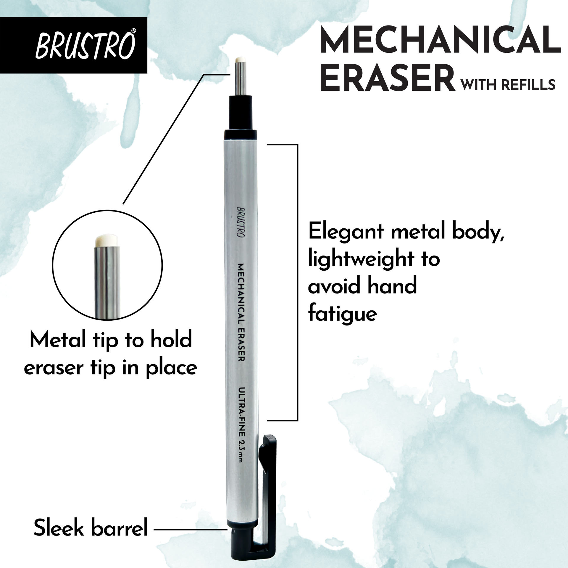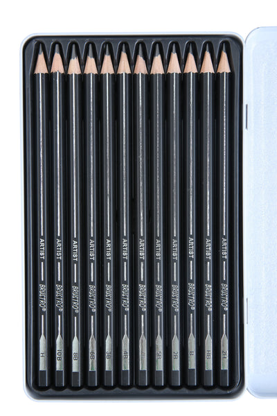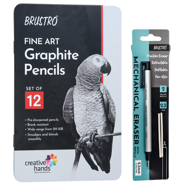 BRUSTRO Fine Art Graphite Pencil - Set of 12 (10B - 2H) with Mechanical Precision Retractable Eraser(2.3mm) | Ideal for Drawing,Sketching,Mandala,Shading,Artwork, Beginners, Artist's and Professionals
