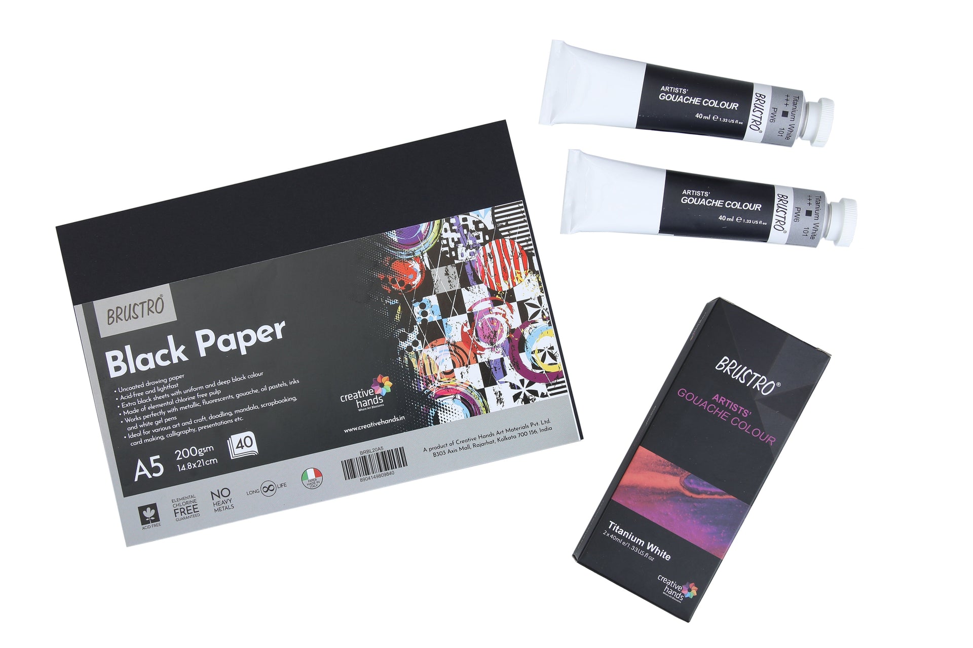 Brustro Gouache Titanium White Twin Pack 40ml Each, with Black Paper A5 40 Sheets
