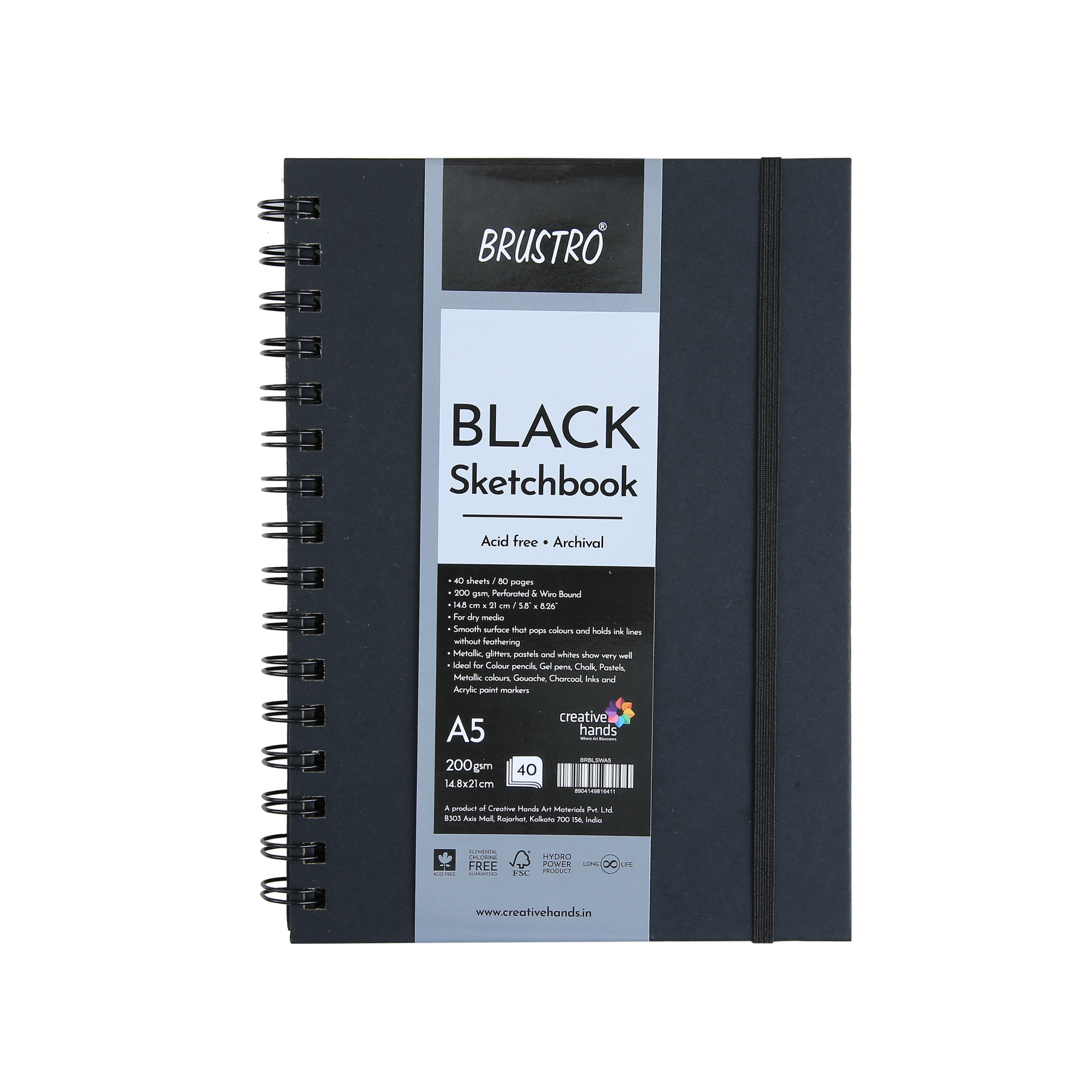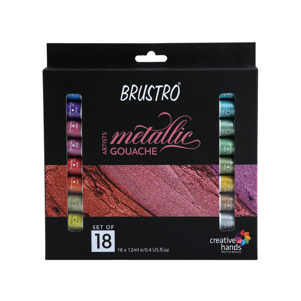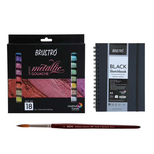 Brustro Metallic Gouache Set of 18 with Kolinsky Imitation WC Travel Brush Round Size 6 & Black Sketchbook, Wiro Bound, Size A5
