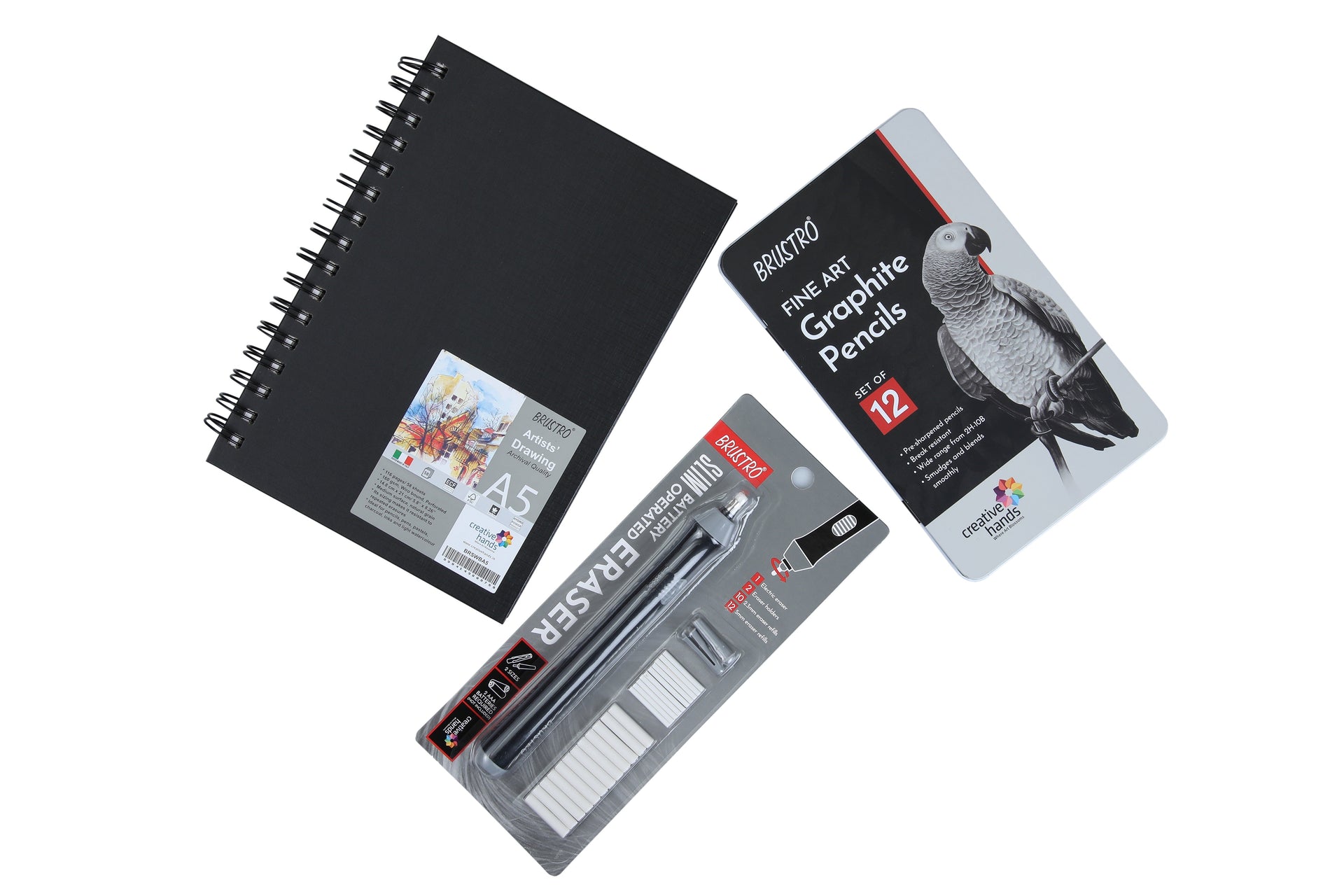 Brustro Slim Battery Operated Eraser + Graphite Pencil Set of 12 + A5 wiro Sketchbook