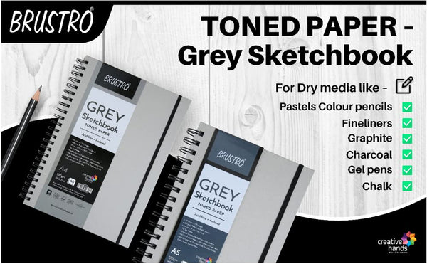 BRUSTRO Toned Paper - Grey Sketchbook | A5, 120 GSM | 60 Sheets/120 Pages |Wiro Bound, Spiral, Drawing, Sketching, Acid-free Paper, Dry media, Mandala Art, Graphite, Charcoal, Colour pencils, Gel pens