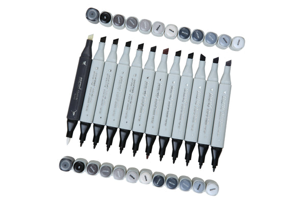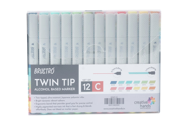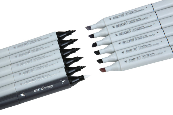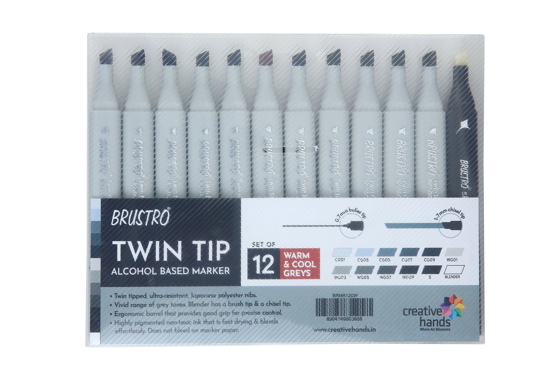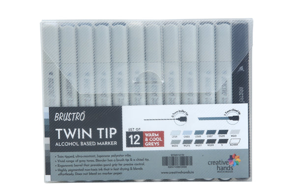 BRUSTRO Twin Tip Alcohol Based Marker Set of 12 Cool & Warm Grey Shades in Crossline PP See Through Box