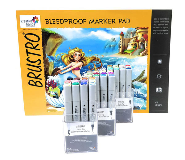 Brustro Twin Tip Alcohol Based Marker Set of 12 Each of Basic A, B & C, with Brustro Bleedproof Marker Pad 70 GSM A3 (Contains 50 Sheets)