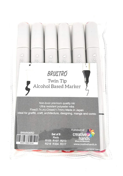 BRUSTRO Twin Tip Alcohol Based Marker Set of 6 (Reds) in Crossline PP See Through Box