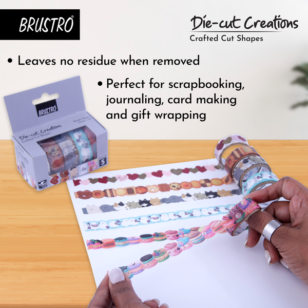 BRUSTRO Die-Cut Creations Washi Tapes | Set of 5 | 15 mm x 3 mtrs | Low Tack Adhesive, Ideal for Scrapbooking, Planners, Card/Gift Wrapping, DIY, Home Decor, Art & Craft Supplies