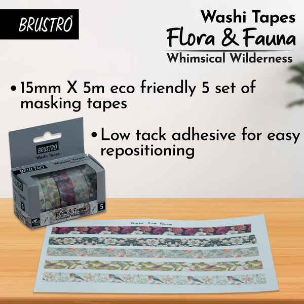 BRUSTRO Washi Masking Tapes |Flora and Fauna Shade|15 mm x 5 mtrs (Set of 5)| Low Tack Adhesive, Ideal For Scrapbooking, Watercolor, Planners, Card/Gift Wrapping, DIY Decor and Craft Supplies
