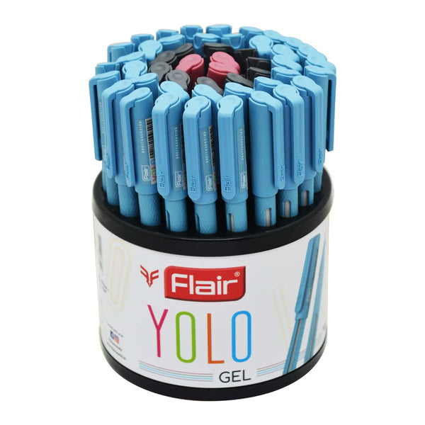 FLAIR Yolo Gel Pen Stand - Waterproof Gel Ink With Stylish Pocketable Clip - Attractive Body Color & Design - Smudge Free & Non-Stop Writing - Blue, Black & Red Ink, Pack of 50 Pens