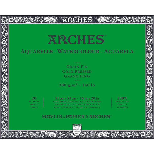 Arches Watercolour Paper an inimitable paper of the highest quality and is 100% cotton paper. Over the centuries, quality has always been paramount and today the manufacturing process brings together traditional techniques with the very latest advances in papermaking technology. Arches paper is made in the village of Arches in the Vosges, France. The high-quality water supplied by river provides optimum conditions to produce excellent paper.This legendary paper is still made with natural cotton fibres, carefully selected for their absorbency and durability. Arches Watercolour Paper is mould-made. The cylinder-mould machine ensures that fibres are evenly distributed which makes the paper extremely stable, so it will not warp or stretch when water is applied to it. Its composition with long fibres of 100% cotton gives the paper its strength, beauty, a natural, lasting whiteness and an inimitable touch with the look and feel of a vintage hand-made paper. Arches is the only paper mill in the world to gelatine size its watercolour paper "to the core". It also allows paints to be removed, either wet or dry, easily revealing the whiteness of the paper. Arches Watercolour can absorb a large amount of water with limited deformation. Arches Watercolour Paper are with 100% cotton fibre content. They are acid-free, pH-neutral, gelatine-sized, Chlorine Free and air-dried. Sheets have two natural deckle edges, two torn deckle edges, and are watermarked and embossed.