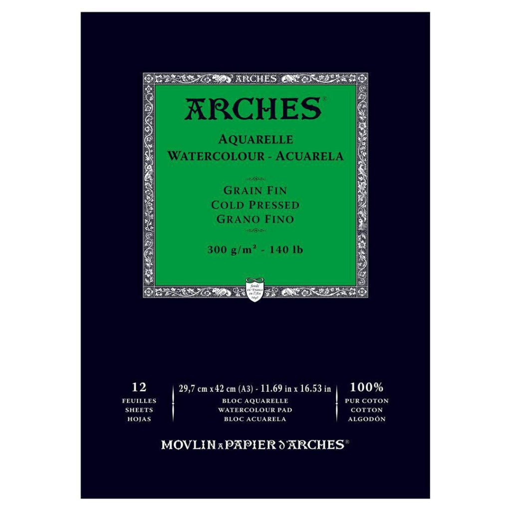 Arches Watercolour Paper an inimitable paper of the highest quality and is 100% cotton paper. Over the centuries, quality has always been paramount and today the manufacturing process brings together traditional techniques with the very latest advances in papermaking technology. Arches paper is made in the village of Arches in the Vosges, France. The high-quality water supplied by river provides optimum conditions to produce excellent paper.This legendary paper is still made with natural cotton fibres, carefully selected for their absorbency and durability. Arches Watercolour Paper is mould-made. The cylinder-mould machine ensures that fibres are evenly distributed which makes the paper extremely stable, so it will not warp or stretch when water is applied to it. Its composition with long fibres of 100% cotton gives the paper its strength, beauty, a natural, lasting whiteness and an inimitable touch with the look and feel of a vintage hand-made paper. Arches is the only paper mill in the world to gelatine size its watercolour paper "to the core". It also allows paints to be removed, either wet or dry, easily revealing the whiteness of the paper. Arches Watercolour can absorb a large amount of water with limited deformation. Arches Watercolour Paper are with 100% cotton fibre content. They are acid-free, pH-neutral, gelatine-sized, Chlorine Free and air-dried. Sheets have two natural deckle edges, two torn deckle edges, and are watermarked and embossed.