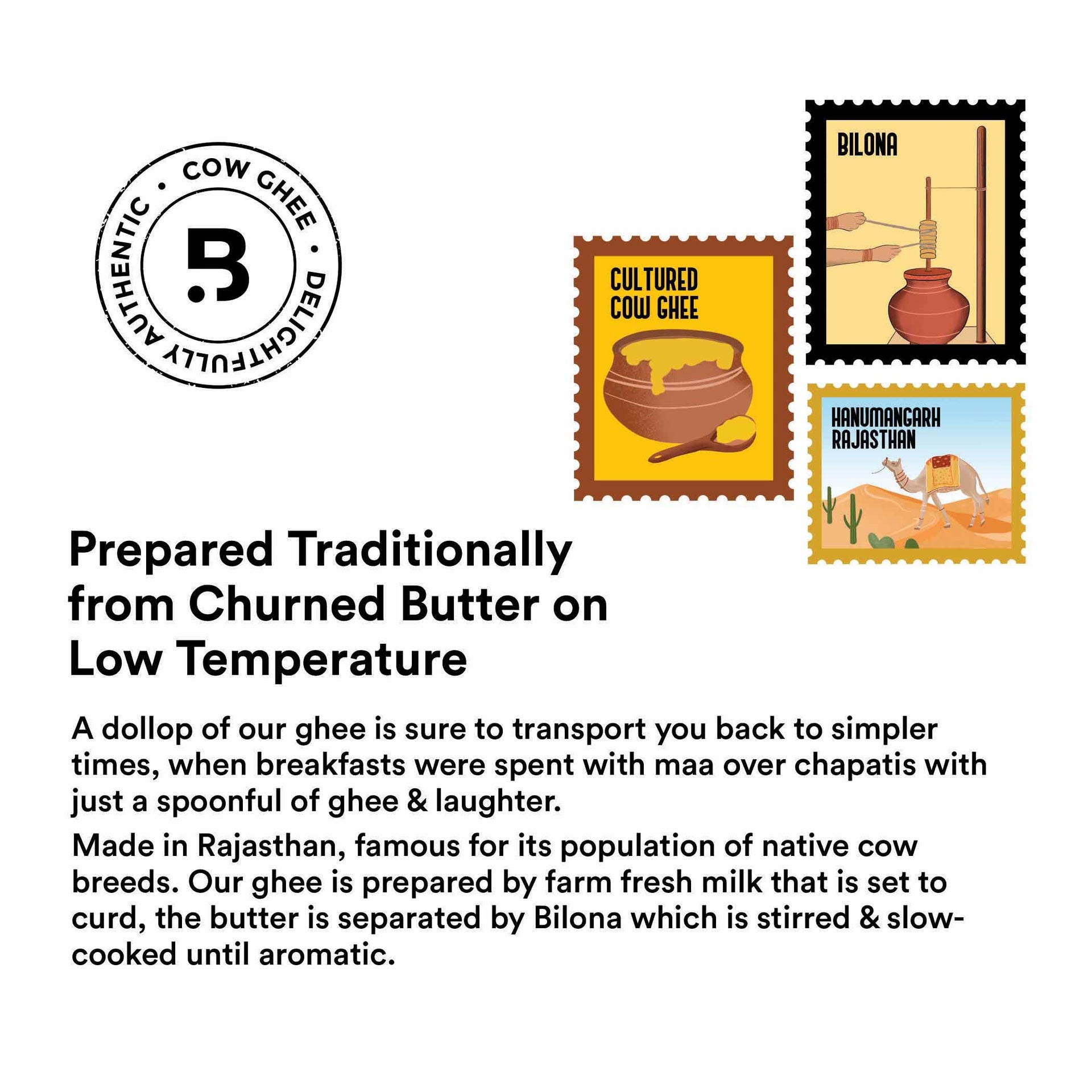 - MADE FROM CURD, NOT CREAM: Barosi Cow Ghee is made from curd, not milk cream. The freshly sourced cow milk is boiled and set to curd, the curd is then hand-churned bi-directionally to obtain butter. The butter is separated and heated slowly to obtain our grainy textured and aromatic Ghee.
