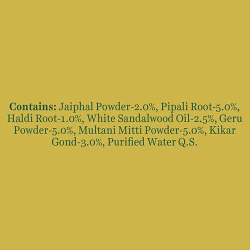 | DESCRIPTION This spot correcting face pack treats pimples and helps control the bacteria that causes breakouts, redness and other skin irritations. | | INGREDIENTS Jaiphal Powder, Pipali Root, Haldi Root, White Sandalwood Oil, Geru Powder, Multani Mitti Powder, Kikar Gond, Purified Water Q.S. | | HOW TO USES Apply to cleansed skin, on affected areas only morning and evening until skin is clear. BEST SUITED FOR OILY & ACNE PRONE SKIN | Country of Origin: India Name of Mfg / Importer / Brand: Bioveda Action Research Company Address of Mfg / Importer / Brand: 42, Rampur Ghat Rd, Paonta Sahib, Himachal | | |