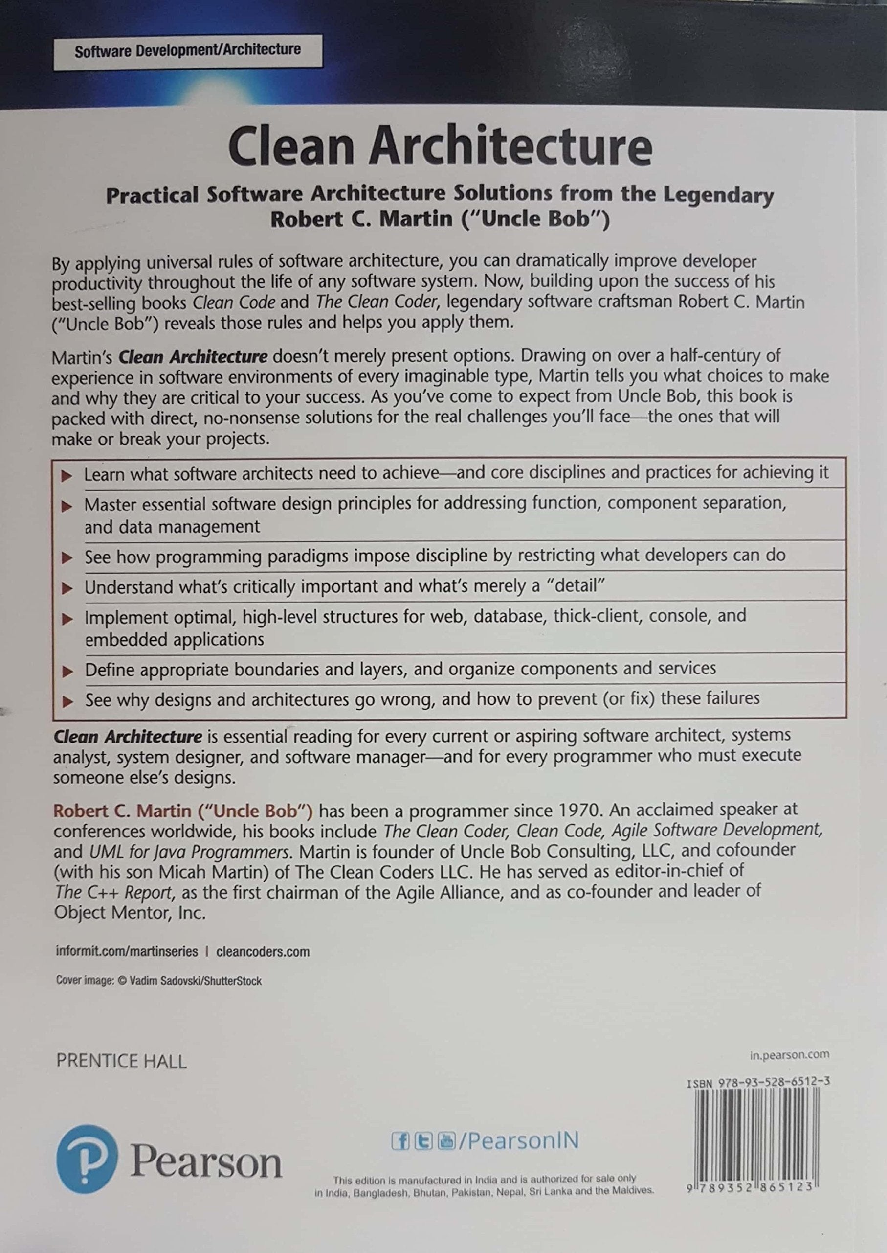 Details: Building upon the success of best-sellers The Clean Coder and Clean Code, legendary software craftsman Robert C. "Uncle Bob" Martin shows how to bring greater professionalism and discipline to application architecture and design.