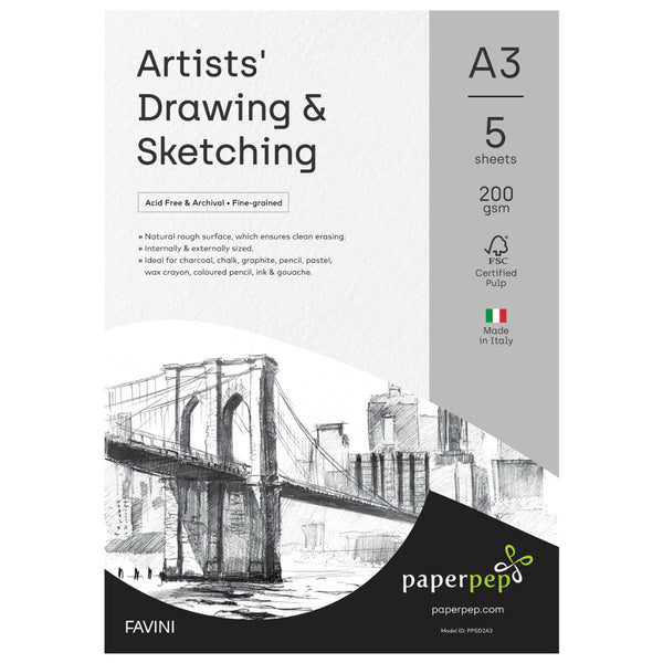 Paper Pep brings you a select range of drawing and artist quality fine papers made to exacting specifications from a high quality cellulose mix. Ideal for different techniques, from dry or hyper-wet to marker or sketch, make them the perfect and complete range for both students and artists. Produced with FSC® certified pulps from responsibly managed forests that are respectful of environmental, social and economic standards. Paperpep Artists' Drawing & Sketching Paper with a fine-grained surface, which ensures clean erasing and exceptional performance, is composed of 100% High Alpha Cellulose, it is internally and externally sized and acid free guaranteeing a conservation quality over long period. It is also acid & chlorine free. It is recommended for students, artists' and amateurs for sketching and drawing with pencil, charcoal, graphite, pastel, wax, coloured pencil & Ink. Its 200GSM is also suitable for gouache. Made in Italy. Available in size A3, A4, A5, 4"X6", 50X70CM and 200 & 90 GSM.
