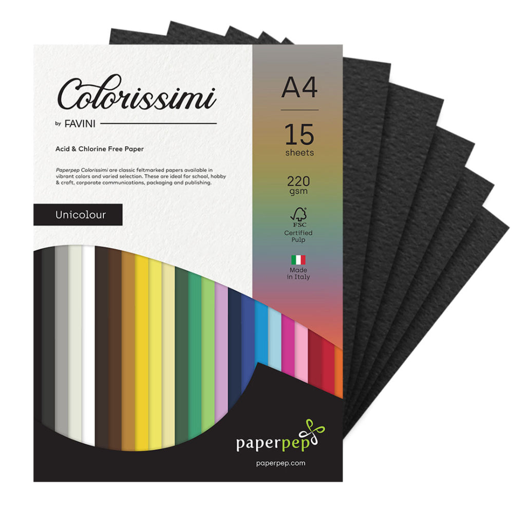 Paper Pep Colorissimi is a high quality coloured in the pulp, 220gsm paper. It is acid free and therefore very long lasting. There's a marked difference in the surface finish between the two sides. One side is a delicate felt-marked surface, which provides excellent grip for pastels, charcoal etc, the other side is smooth. Produced with FSC® certified pulps from responsibly managed forests that are respectful of environmental, social and economic standards. The broad range of 27 colours, from delicate pastel shades to strong, bright colours makes Paper Pep Colorissimi ideal for various applications such as display and presentation, paper construction, collage, pastel and charcoal paintings, coloured pencils, pen and ink, origami, report covers etc. Ideal for different techniques, from scrapbooking, cardmaking, or running through your die cutting and embossing machine to create embellishments for scrapbook layouts, tags, gift bags, and a whole lot more, make them the perfect and complete range for both students and artists. Create something amazing, cut out wonderful shapes and just let your imagination go bonkers! Due to its thickness and texture, it should be tested on one sheet before printing, but nevertheless it is suitable for both inkjet and laser printing. Paper Pep Colorissimi is available in four sizes: A5, A4, 305 x 305mm (12" x 12") and 500 x 700mm (approx. 28" x 20"). Made in Italy.