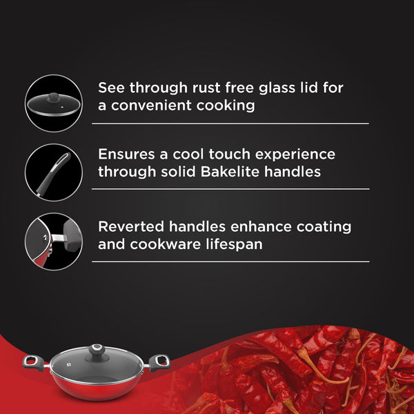 ‎Preethi Dura Collection Non Stick Kadai, 24 cm, with Glass Lid, Gas & Induction Compatible, 5 Star Non Stick Effect, Chilly Red