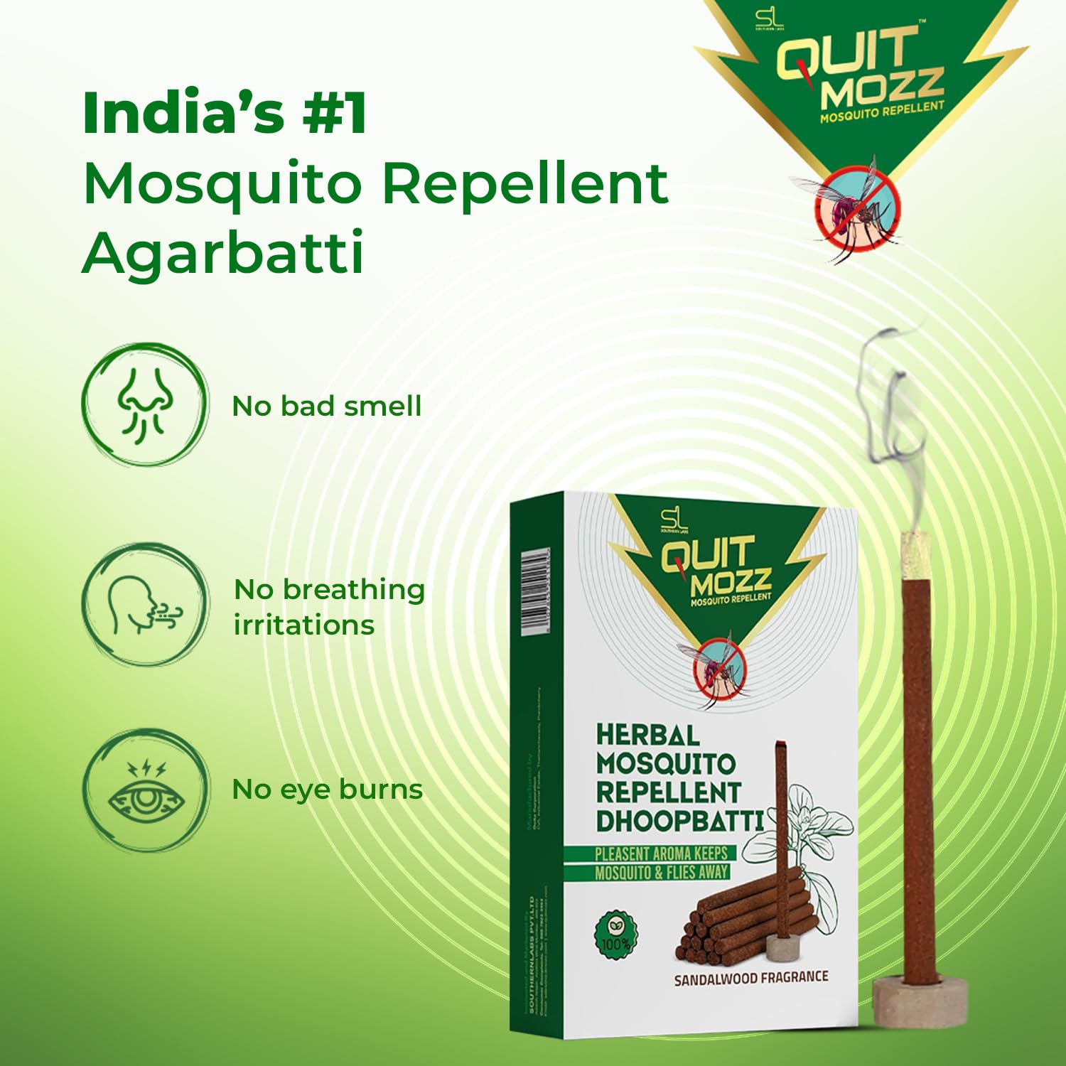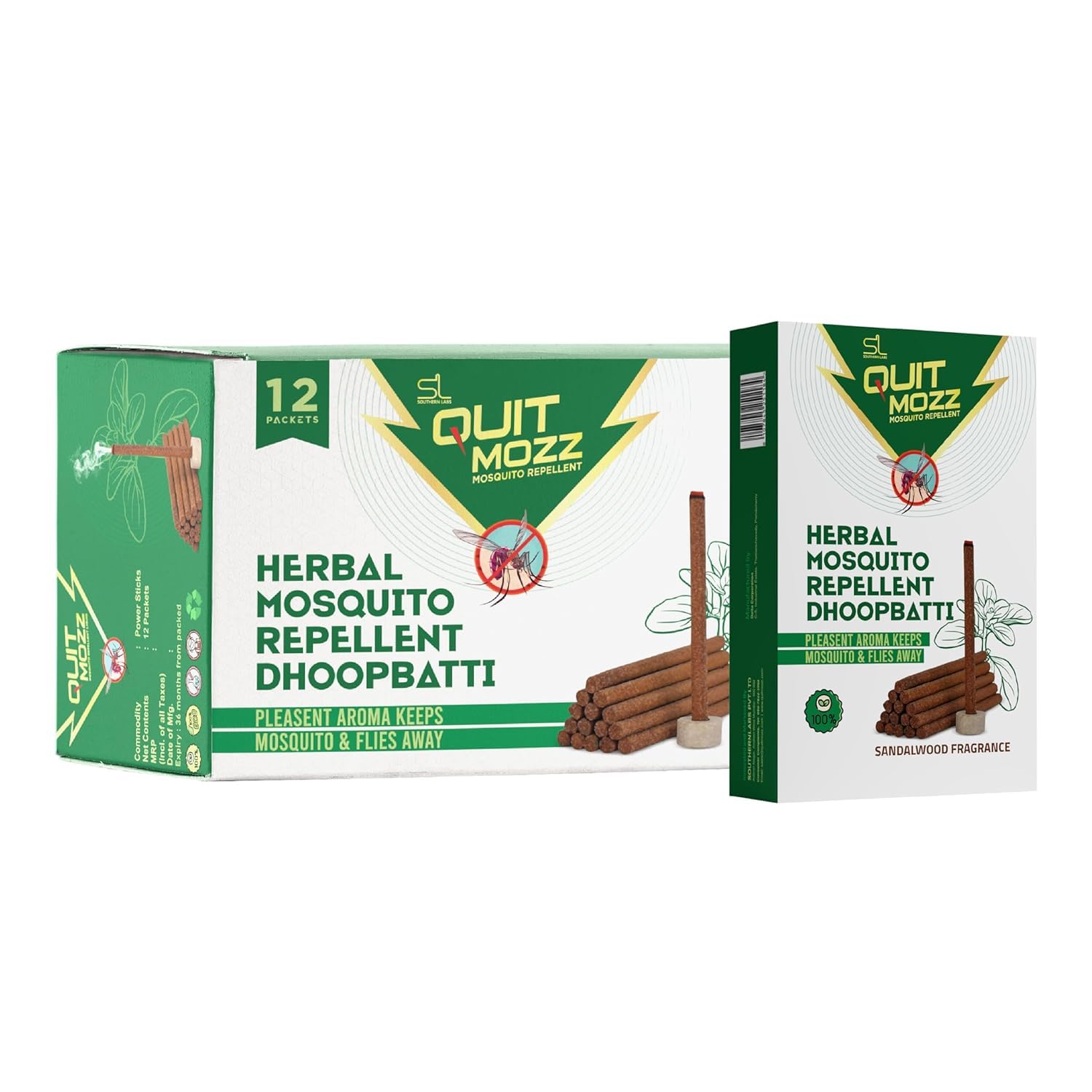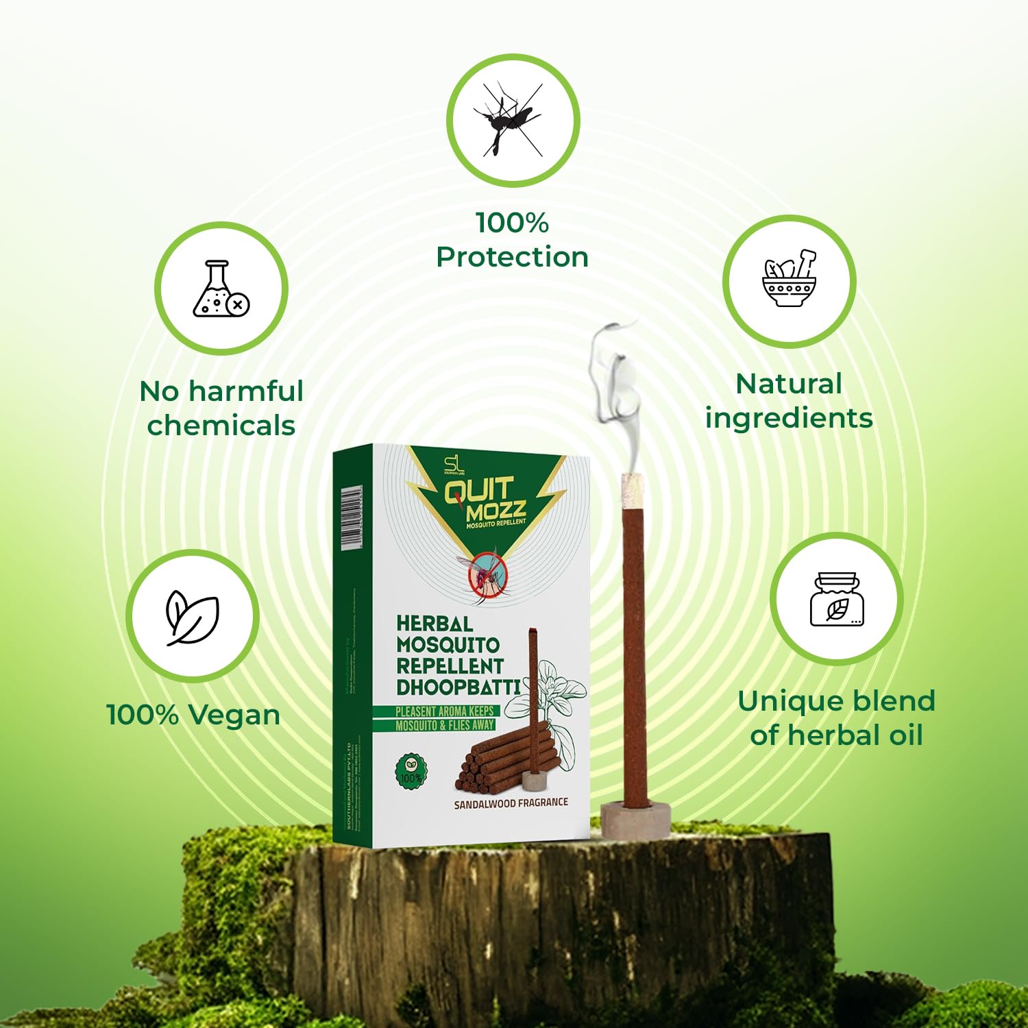 - ⏳𝗟𝗼𝗻𝗴-𝗟𝗮𝘀𝘁𝗶𝗻𝗴 𝗣𝗿𝗼𝘁𝗲𝗰𝘁𝗶𝗼𝗻: QUITMOZZ Mosquito Repellent Dhoopbatti provides continuous protection against mosquitoes for an extended period. Each stick burns for a certain duration, emitting fragrance and repelling mosquitoes throughout its burning time.