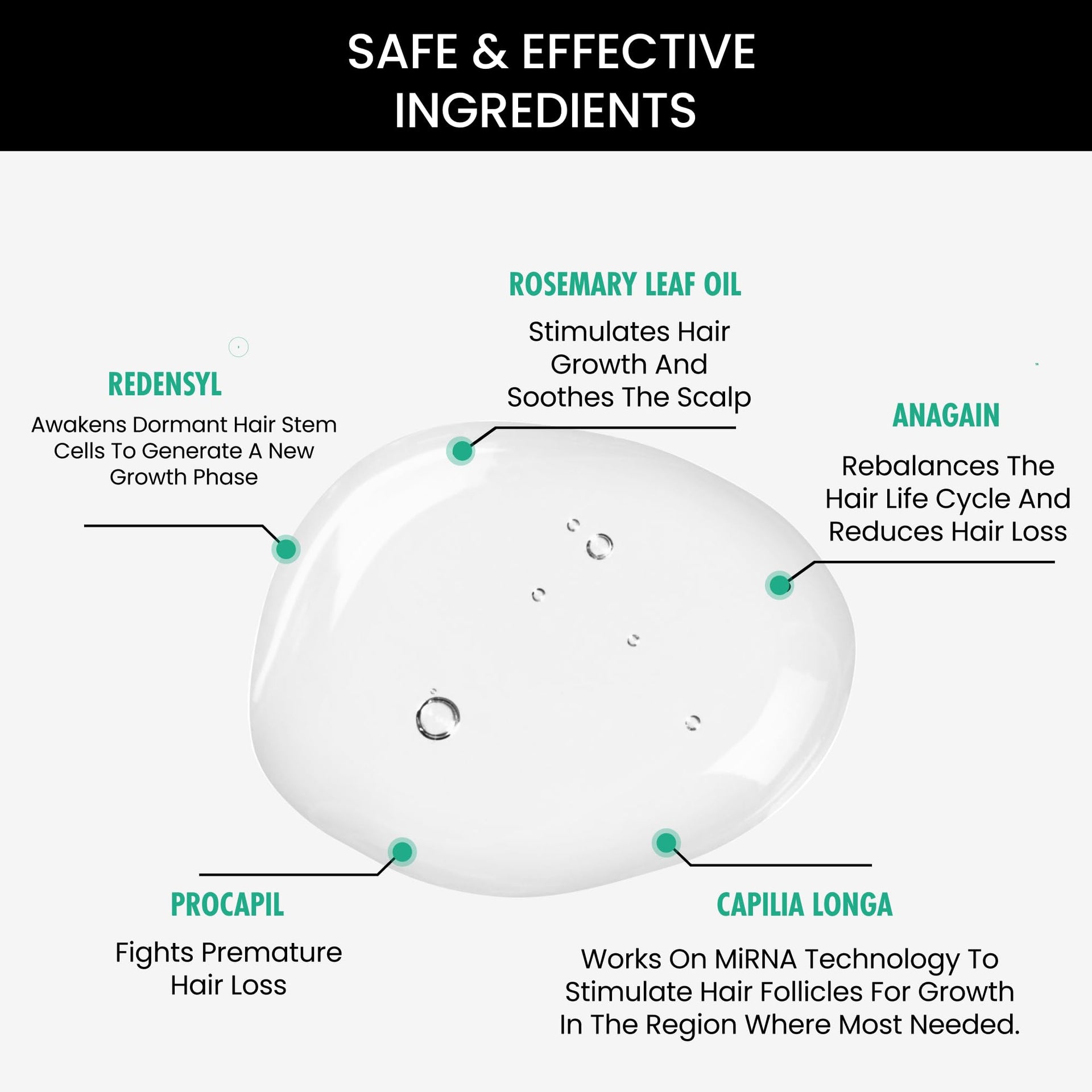 - AWARD-WINNING INGREDIENTS: Formulated with Regendil (a properietary highly-effective and deep-penetration combination of Redensyl, Procapil, Anagain & Capilia Longa) and Rosemary oil to minimize hair fall, improve hair growth and strengthen scalp health. Redensyl, Anagain (derived from pea sprout extract), and Capilia Longa (derived from turmeric) work together to boost NEW hair growth, volume, and thickness. Procapil enhances hair density and fights premature hair loss.