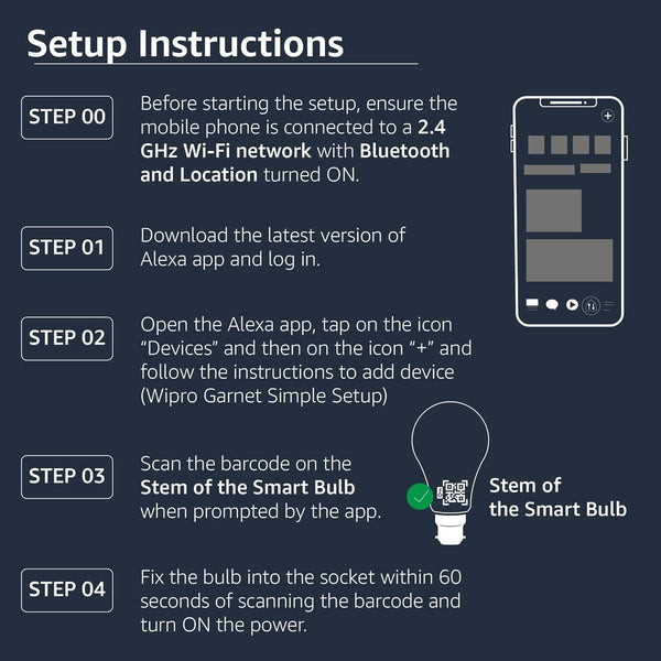 - Simple Setup with Alexa: Fit in the light bulb, open the Alexa app, and get started in minutes as you get notified “First light bulb found” Or you can add the smart bulb directly from Alexa app. No hubs or 3rd party apps or skills required. For zero touch set up experience, check “Link device to your Amazon account to simplify setup” during checkout and get started with your smart bulb in no time. Note: Wipro Garnet Simple-Setup Smart Bulb bulbs work exclusively with Alexa to be set up with 2.4GHz Wi-Fi only.
